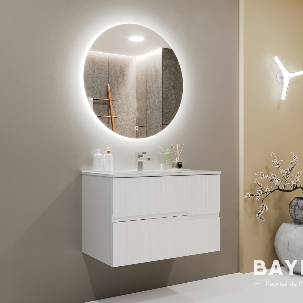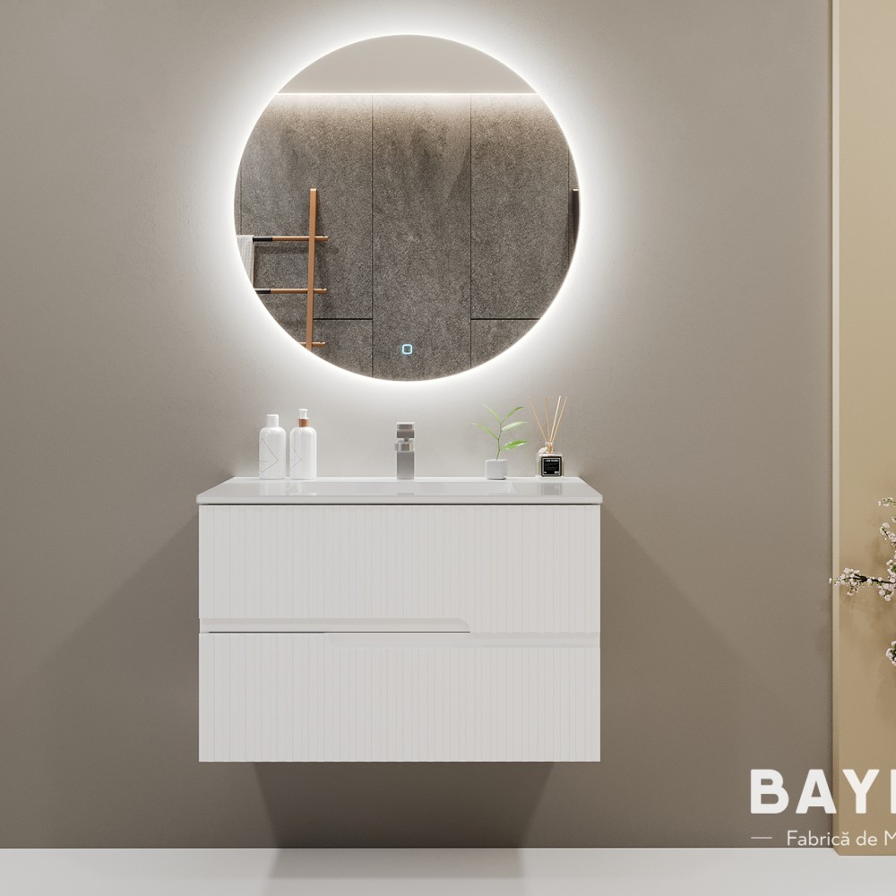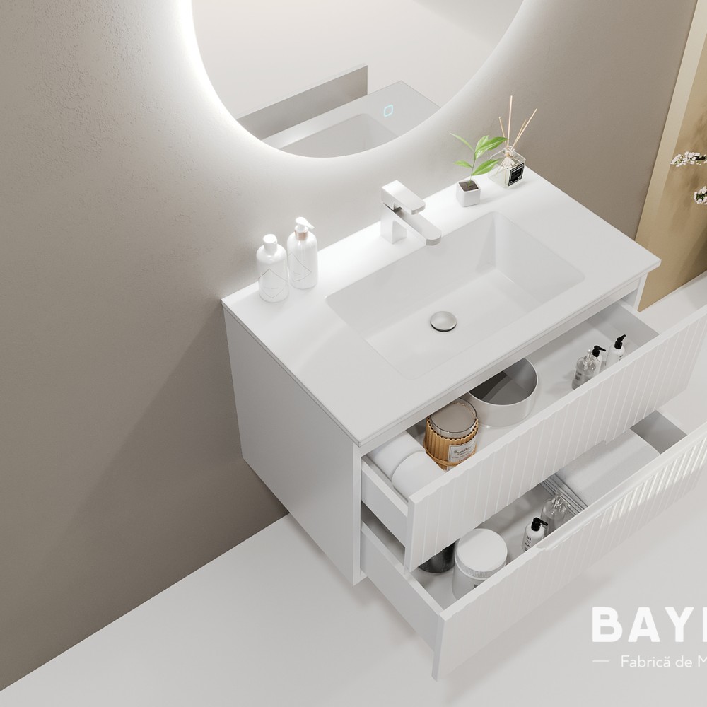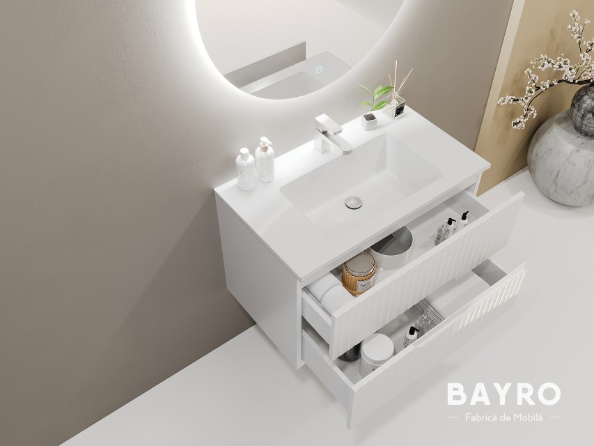 Colecția Santos este alegerea perfectă pentru o baie modernă și luminoasă. Dulapurile suspendate cu lavoar, disponibile în trei dimensiuni, se remarcă prin fațadele albe cu textură reliefată și un design minimalist. Sertarele spațioase oferă confort și funcționalitate, iar aspectul elegant aduce un plus de rafinament fiecărui spațiu. Liniile curate și finisajul alb transformă setul Santos într-o soluție ideală pentru băi de orice dimensiune.