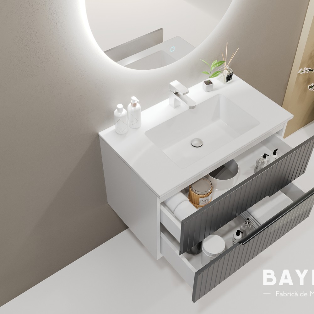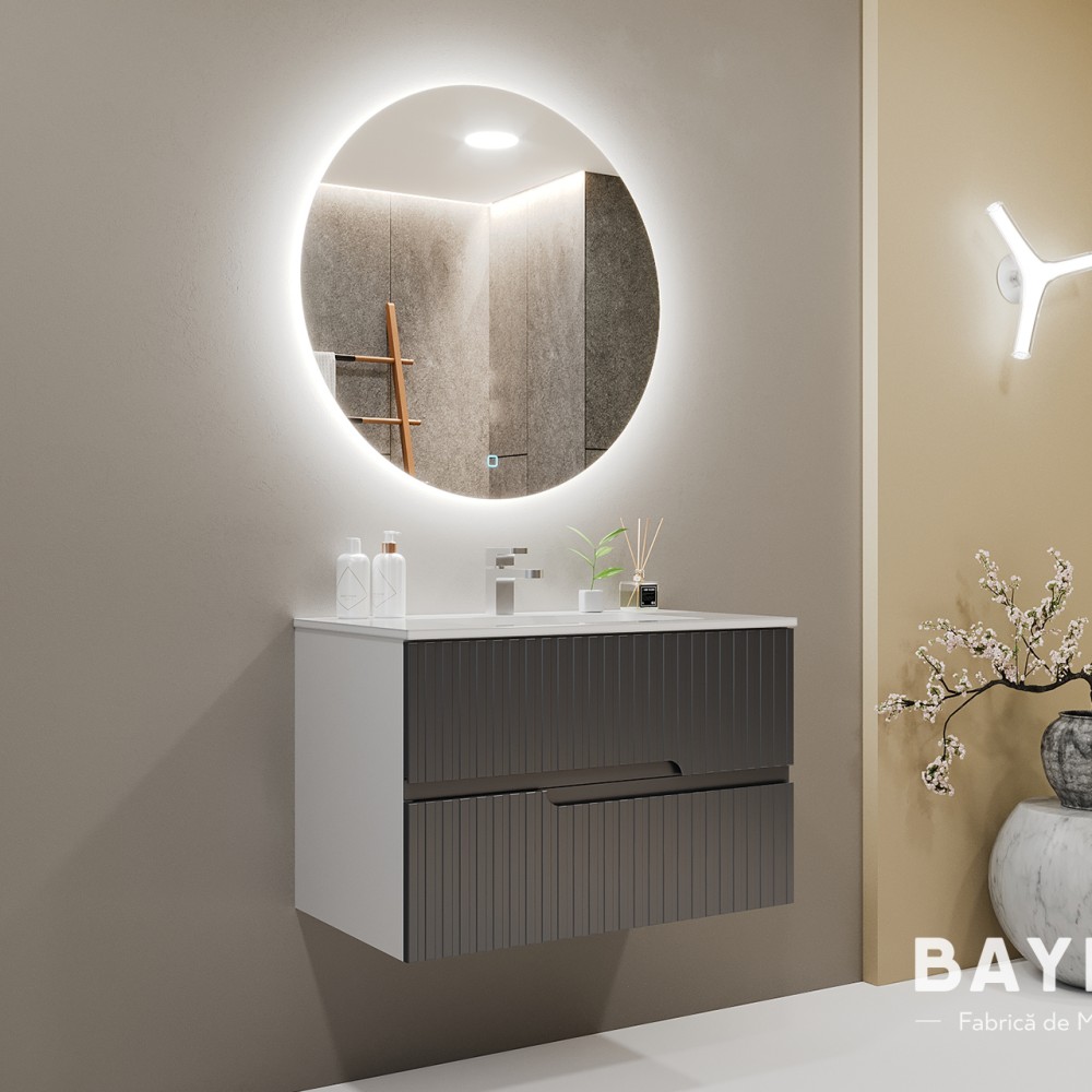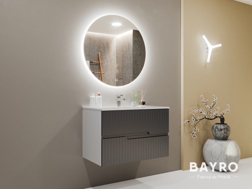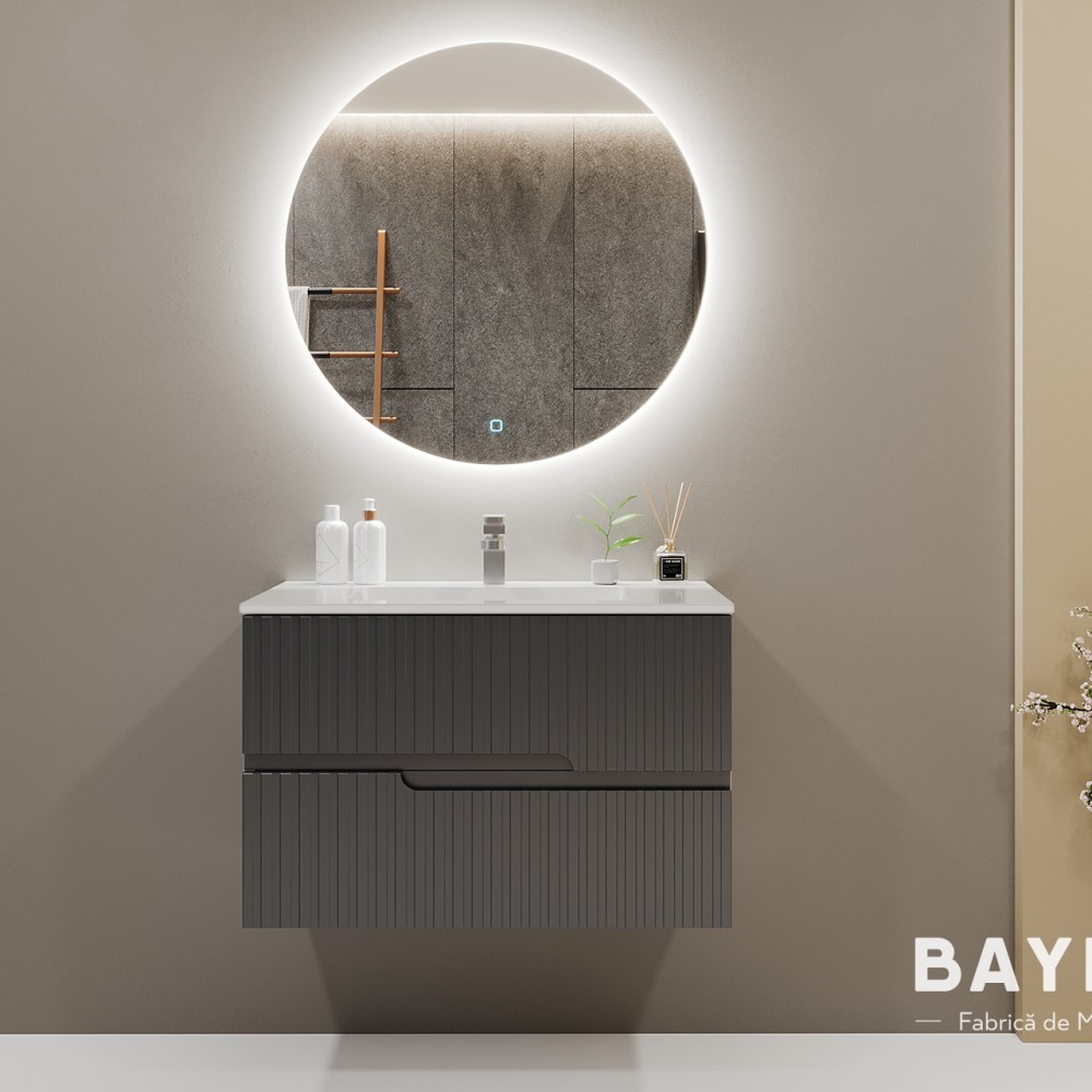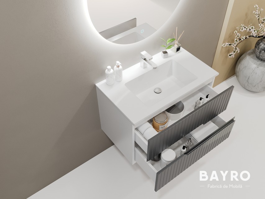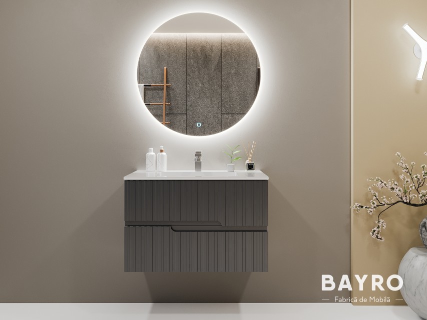 Modelul Santos în finisaj antracit impresionează prin rafinament şi profunzime. Tonul închis adaugă un aer modern şi elegant băii tale, iar textura reliefată a faţadelor accentuează designul contemporan. Dulapul suspendat, cu sertare spaţioase, oferă confort şi funcţionalitate, păstrând totodată o estetică sofisticată. Perfect pentru cei care apreciază combinaţia dintre stil urban şi eleganţă atemporală.