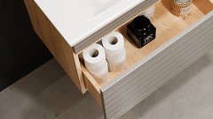 Коллекция, посвященная ламелям и сдержанным цветам, с нетерпением ждет, чтобы завоевать вашу ванную комнату! Независимо от ее размера, мебель из линейки Avanti найдет свое место, будьте уверены! Шкаф-колонна образует единый фронт с навесным шкафом. Для второго у вас есть два варианта раковины. Корпус имитирует дерево.