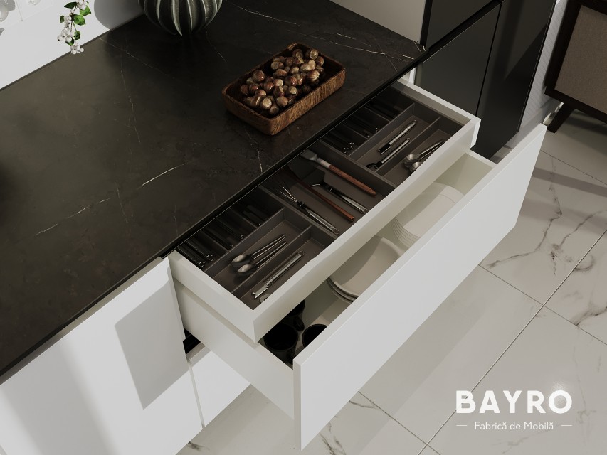 Эта кухня с современным дизайном создана для тех, кто ценит элегантные и практичные решения. Фасады из МДФ с отделкой soft touch в двух изысканных оттенках добавляют элегантности и глубины интерьеру. Матовая и гладкая на ощупь поверхность устойчива к отпечаткам пальцев и сохраняет ухоженный вид.