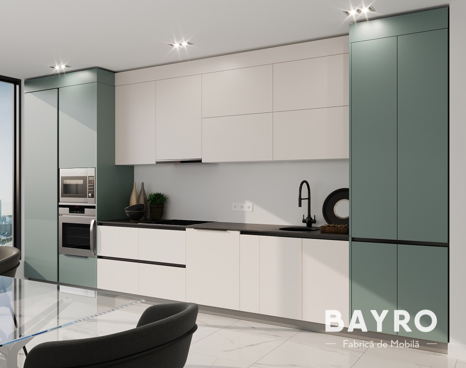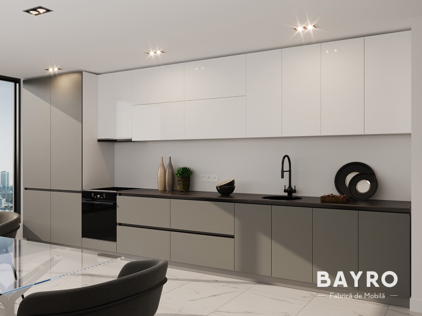 Сочетание глянцевых и матовых поверхностей создает тонкую визуальную гармонию, обеспечивая идеальный баланс между стилем и практичностью. Эта кухня — идеальный выбор для изысканного и современного интерьера.