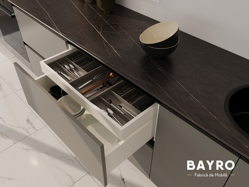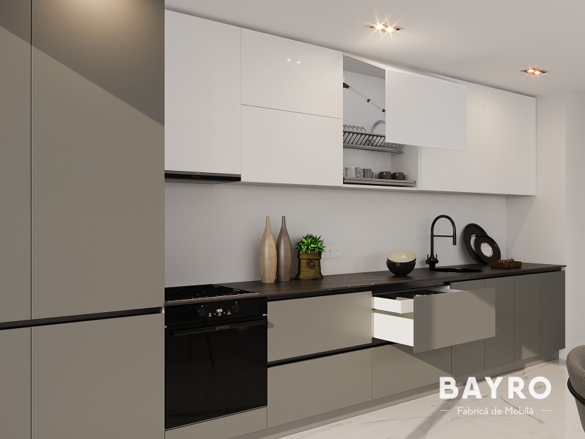 Нижние шкафы из матового ДСП в суровом оттенке асфальта создают элегантный контраст и придают современную глубину.