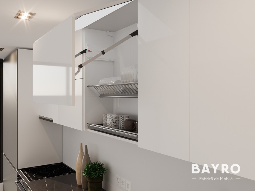 Эта кухня создана для тех, кто ценит изысканность и функциональность в равной степени. Фасады навесных шкафов, выполненные из глянцевого белого МДФ, добавляют светости и воздушности всему пространству.
