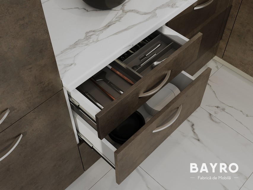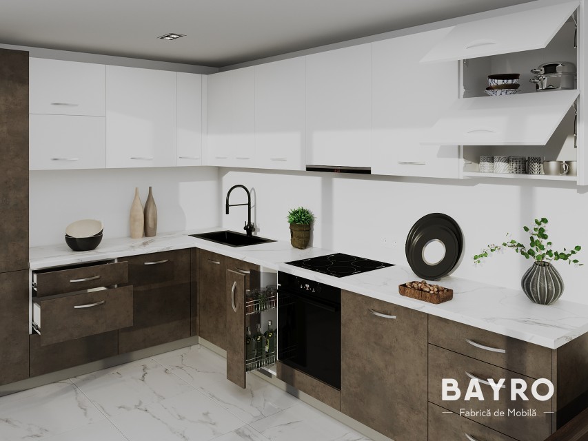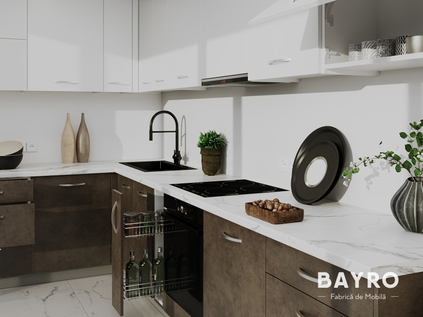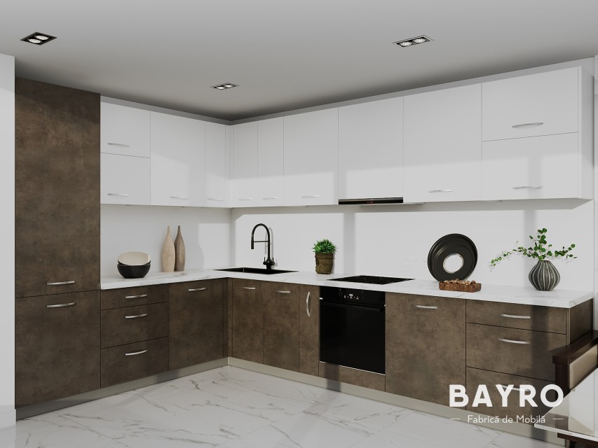 В этой кухне матовые белые фасады гармонично сочетаются с фасадами, имитирующими структуру бетона. Кухня создает теплую и уютную атмосферу, выполнена в современном стиле с минималистичными акцентами. Все элементы, включая фурнитуру и внутреннюю компоновку, отличаются надежностью и функциональностью. Возможность создать индивидуальный комплект обеспечивает комфорт и элегантность вашей кухни.