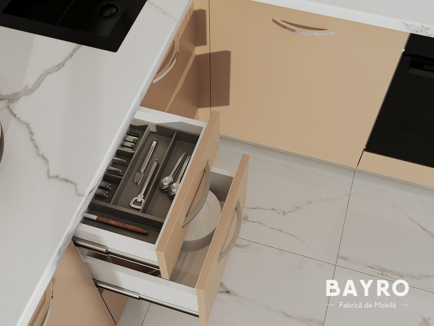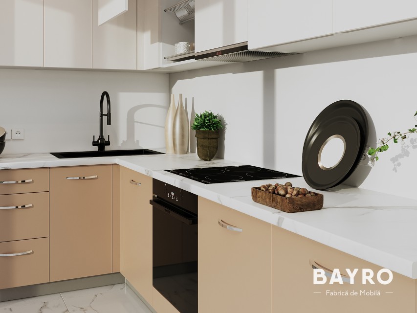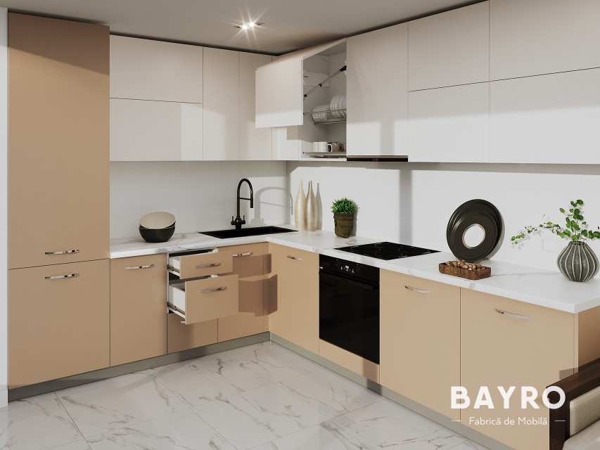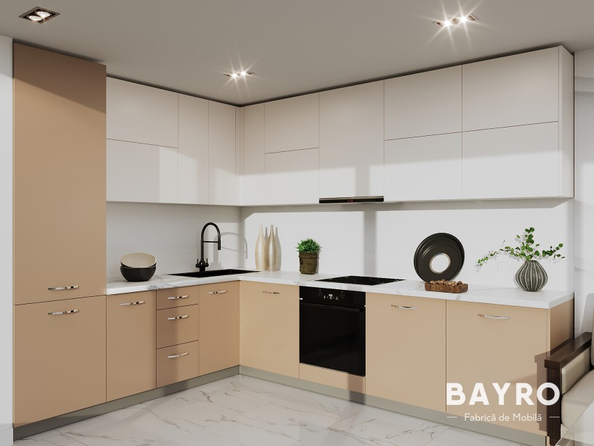 Кухня BAYRO гармонично сочетает в себе элегантность и функциональность. Нижние фасады из МДФ теплого оттенка Cappuccino и верхние фасады из МДФ нежного оттенка Light Cream создают сбалансированный и изысканный дизайн. Белый корпус из ДСП толщиной 18 мм придает кухне чистый и современный вид, а столешница Swiss Krono толщиной 38 мм в оттенке Marble Gelato добавляет изысканности. Хромированные ручки подчеркивают премиальный стиль, превращая каждую деталь в приятное впечатление. BAYRO – кухня, где красота и комфорт идеально сочетаются!
