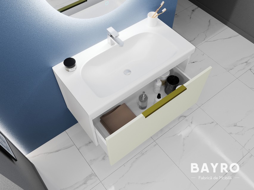 Навесной шкаф серии Gold создан для тех, кто верит, что суть кроется внутри. Вместительное отделение для хранения (в том числе и по высоте, даже если внешний вид говорит об обратном) предлагает достаточно места для множества вещей. Раковина с её изящными округлыми формами настраивает на спокойствие и расслабление. Ручка в матовом оттенке золотисто-оливкового цвета добавляет нотку изысканности и вневременной элегантности.