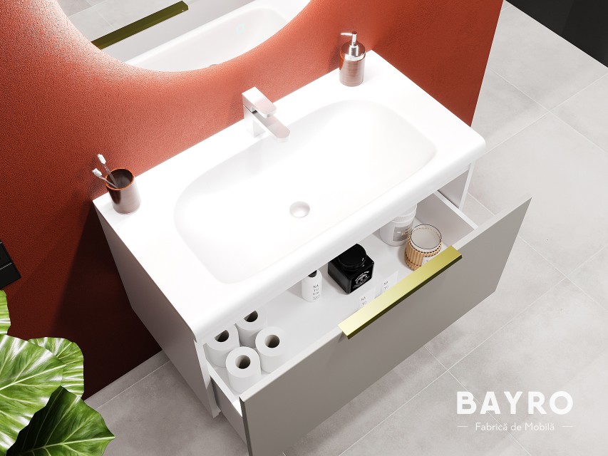 Навесной шкаф серии Gold создан для тех, кто верит, что суть кроется внутри. Вместительное отделение для хранения (в том числе и по высоте, даже если внешний вид говорит об обратном) предлагает достаточно места для множества вещей. Раковина с её изящными округлыми формами настраивает на спокойствие и расслабление. Ручка в матовом оттенке золотисто-оливкового цвета добавляет нотку изысканности и вневременной элегантности.