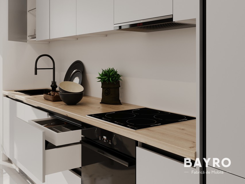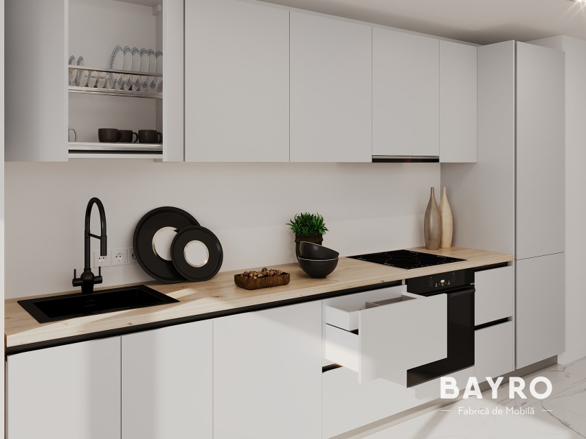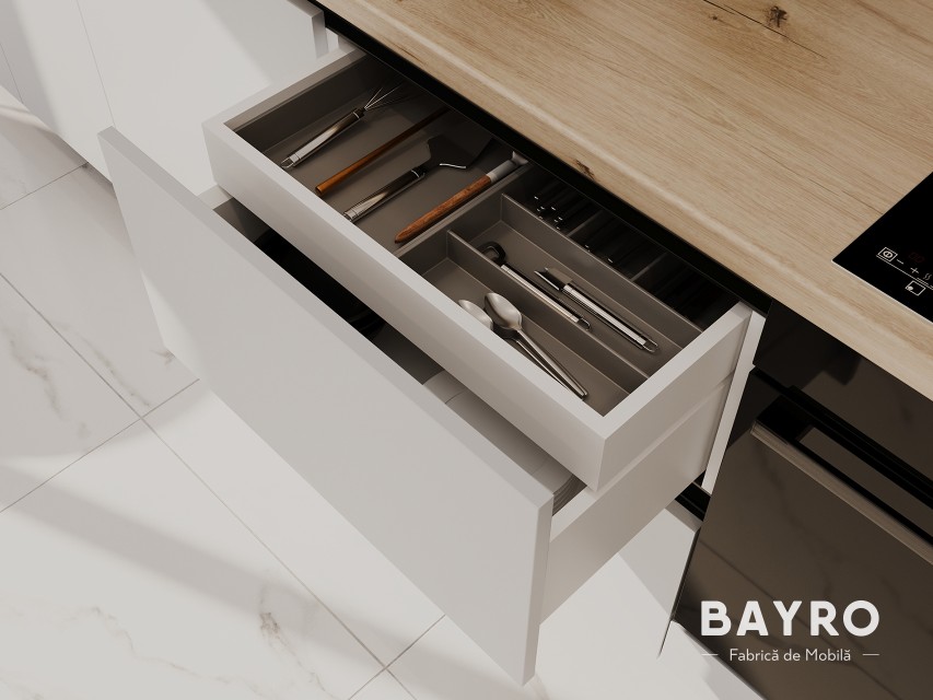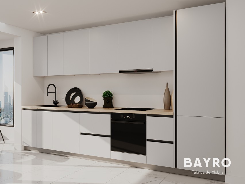 Версия современной кухни в минималистском стиле. Модель включает фасады из МДФ с поверхностью Soft Touch в оттенке light grey. Встроенные ручки подчеркивают изысканную элегантность поверхностей. Кухня выглядит просторной и воздушной, идеально подходит для современного и функционального интерьера.