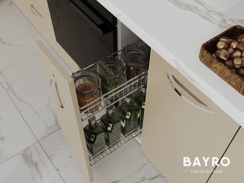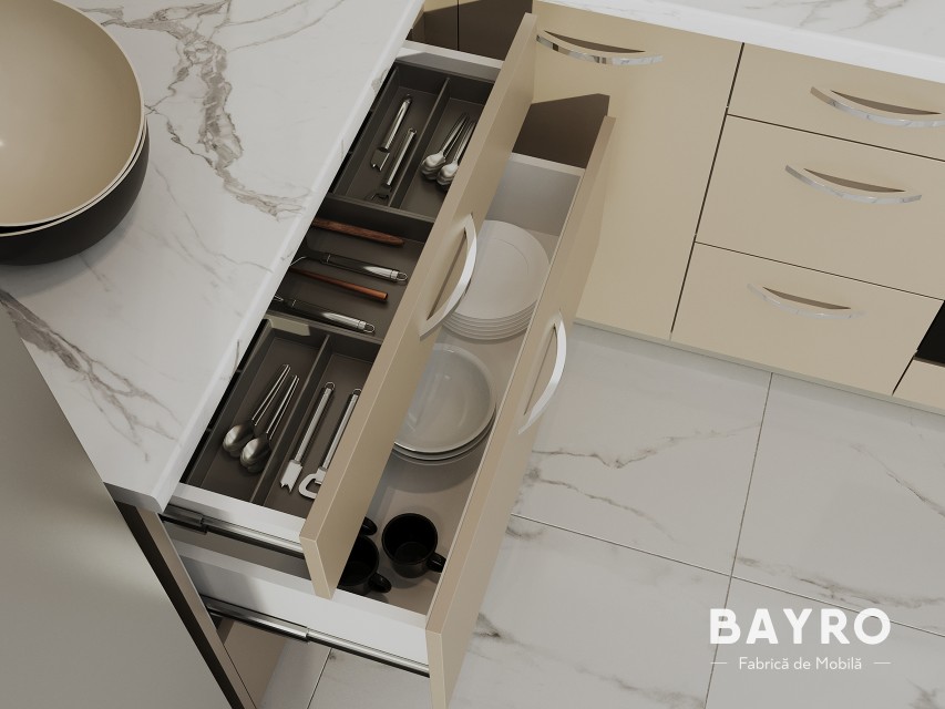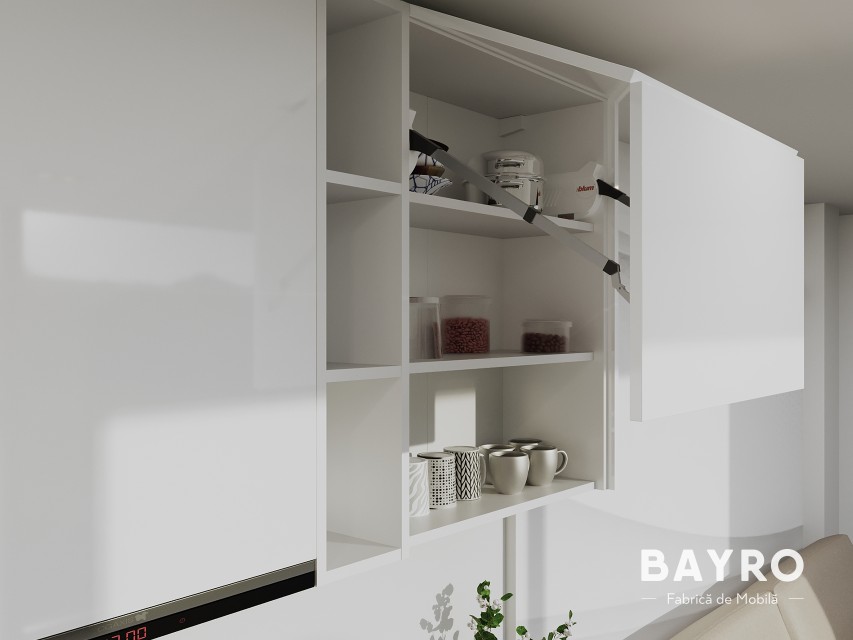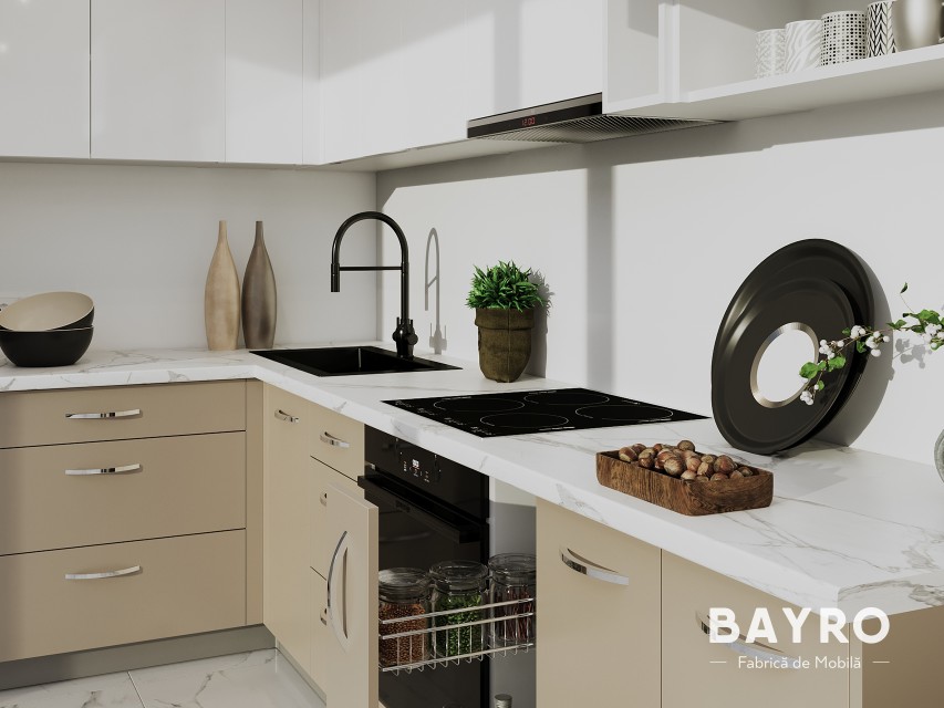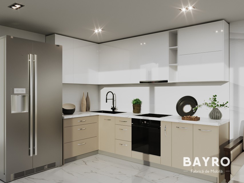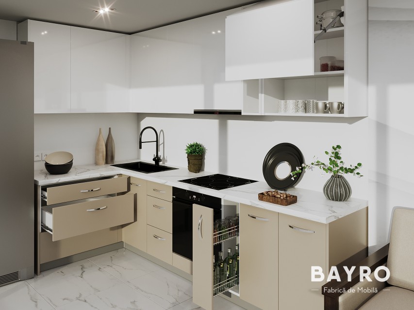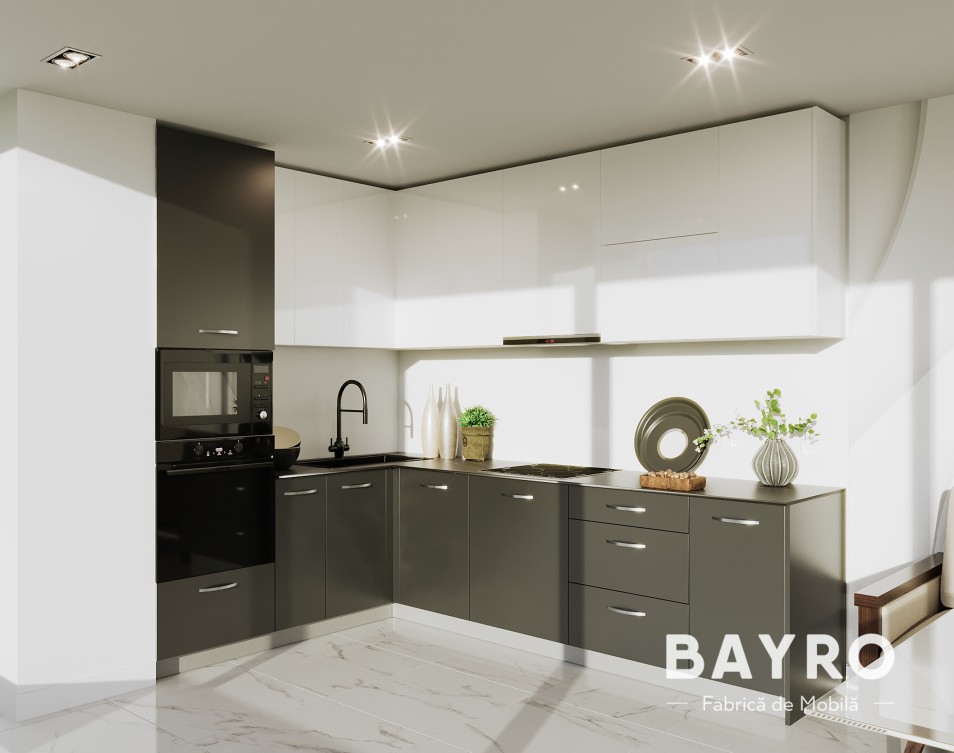 В этой кухне гармонично сочетаются два типа фасадов: глянцевый белый для верхних корпусов и отделка из серого камня для нижних. Корпус мебели изготовлен из 18-миллиметрового ДСП, что обеспечивает долговечность и прочность. Хромированные ручки придают изделию дополнительную элегантность и удобство в использовании. Идеальный выбор для современного и функционального дизайна!