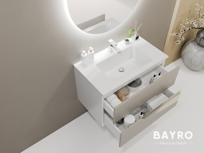 Модель Santos Light Grey привнесёт в вашу ванную комнату нотку гармонии и света. Светло-серый оттенок создаёт спокойную и изысканную атмосферу, подходящую как для современных, так и для классических интерьеров. Рельефные фактурные фасады добавляют глубину дизайну, а подвесная конструкция создаёт ощущение простора и лёгкости. Практичные ящики дополняют элегантный облик, делая Santos Light Grey идеальным выбором для минималистичного и гармоничного интерьера.